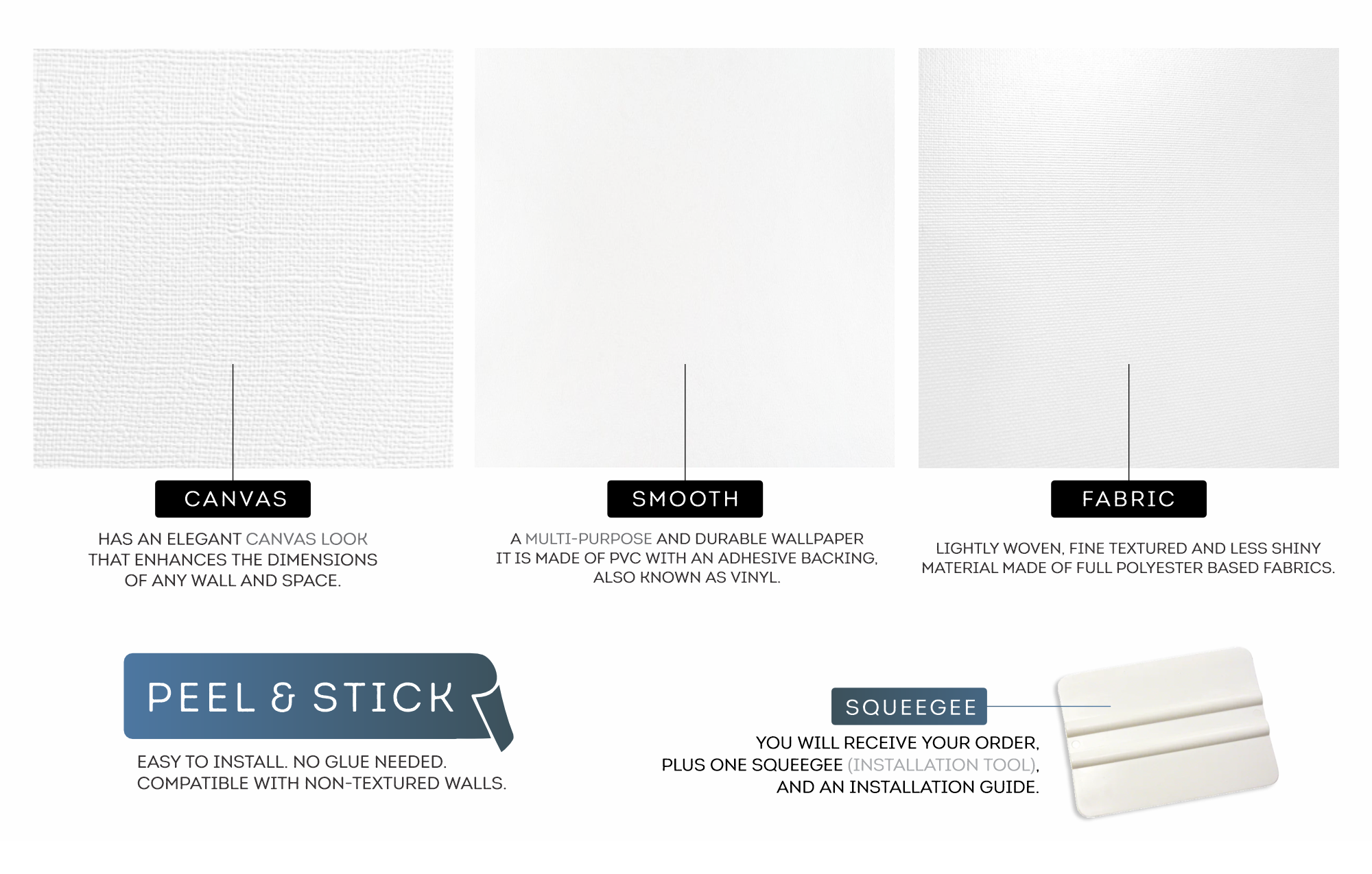 We offer a range of high-quality wallpapers, including smooth vinyl, fabric, and canvas options, all with easy peel-and-stick application.